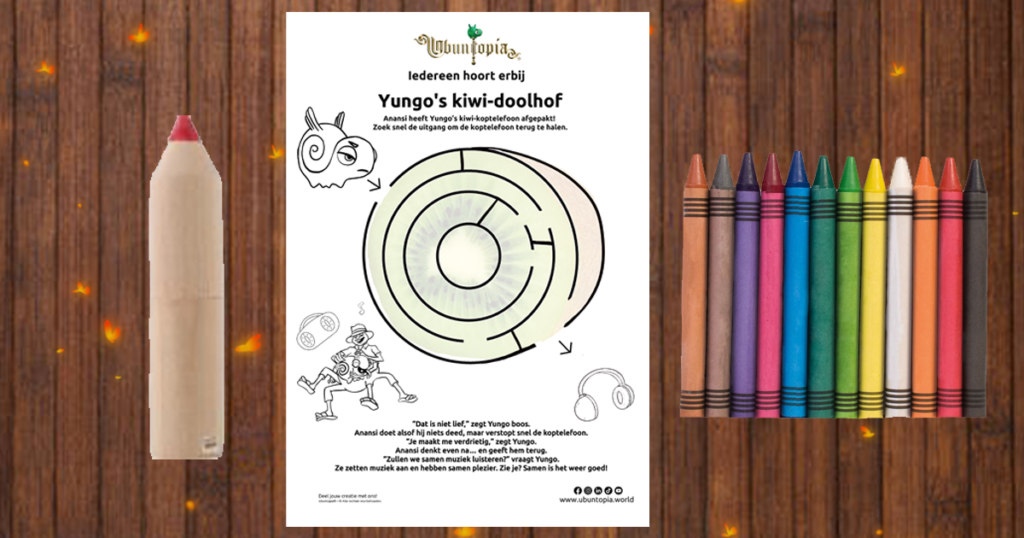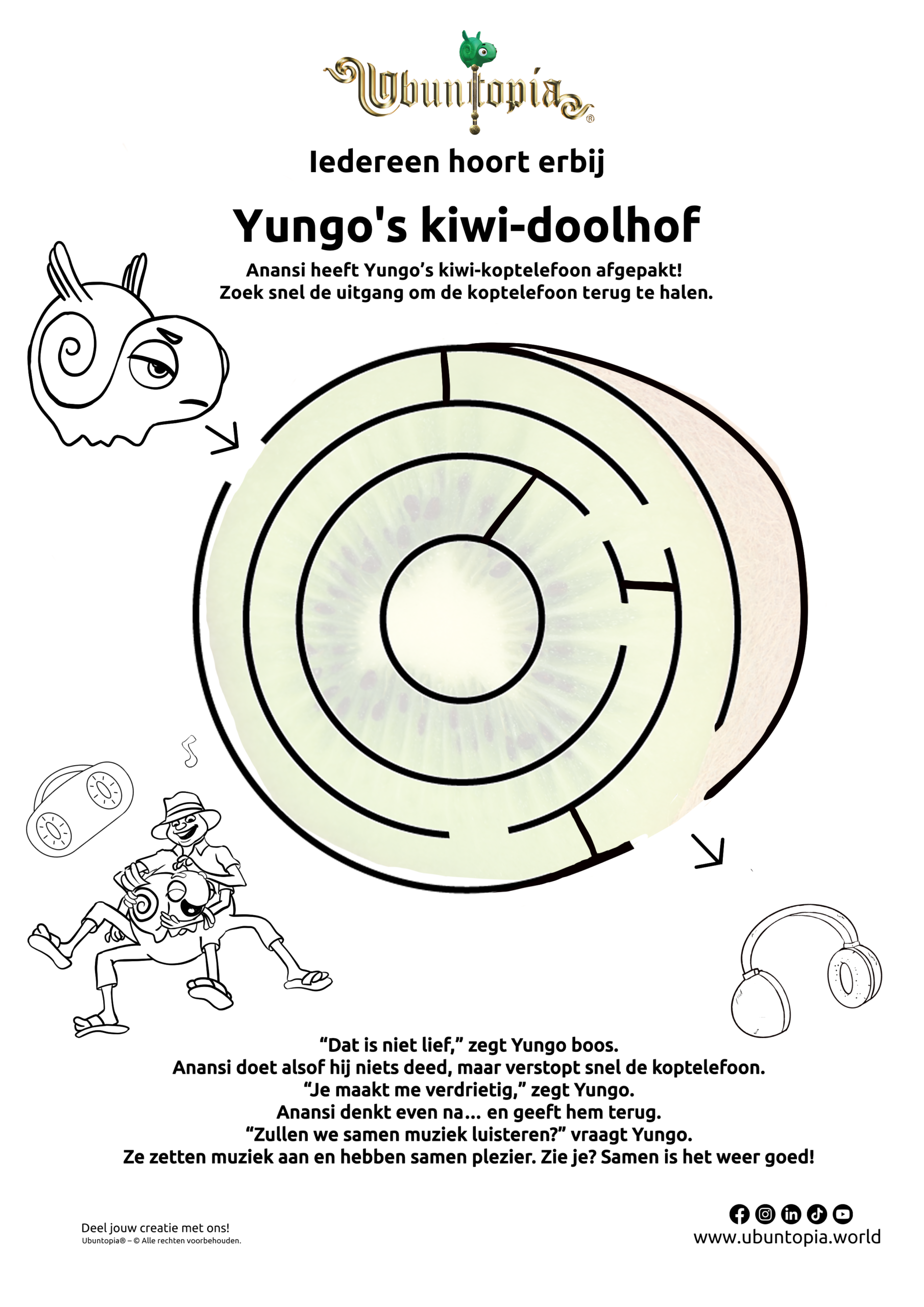 In Yungo’s kiwi-doolhof pakt Anansi de kiwi-koptelefoon van Yungo af. Wanneer Yungo ontdekt wat er is gebeurd, staat Yungo voor een belangrijke keuze. Wat zou jij doen? Je ontdekt het in Yungo’s kiwi-doolhof.